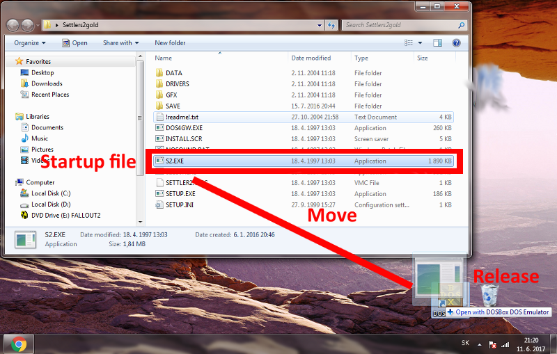 3. Otevřete adresář s nainstalovanou hrou a "přeneste" spouštěcí soubor na ikonu DosBOX nacházející se na vaší Pracovní ploše (viz obrázkový návod níže).